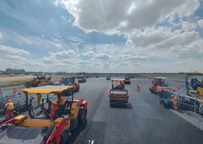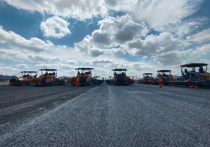 想象一下,航班在西跑道頻繁起降的同時(shí),數(shù)百名施工人員和數(shù)百輛設(shè)備,就在幾百米外忙碌作業(yè)。施工挑戰(zhàn),前所未有的嚴(yán)峻。傳奇,在這短暫的15天一一上演。不過,這傳奇的紙簿上,亦被烙上“徐工金”的身影。徐工成套道路機(jī)械,在此項(xiàng)高難度施工中,迎難而上、挑起重?fù)?dān)。