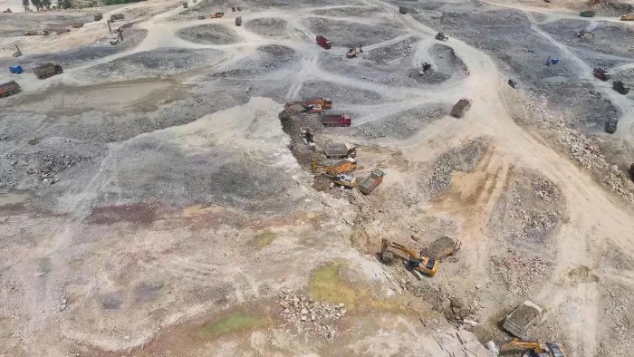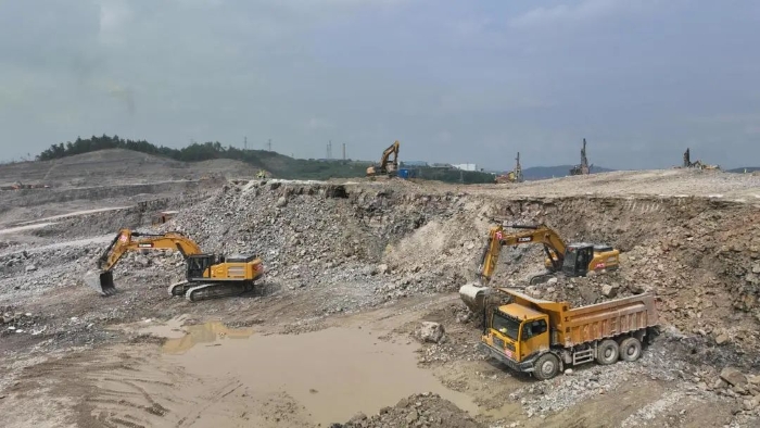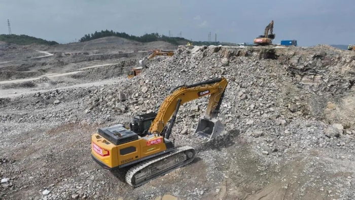 前期爆破剝離工序后,徐工20噸挖掘機(jī)搭配140的小破碎錘進(jìn)行二破,同時(shí)XE380GK、XE600GK等機(jī)型進(jìn)行挖裝作業(yè)。現(xiàn)場(chǎng)共投入挖掘機(jī)50多臺(tái),每天的挖方量在10萬(wàn)方左右。