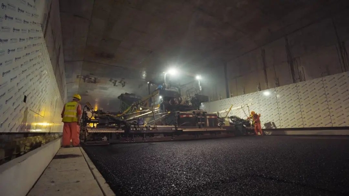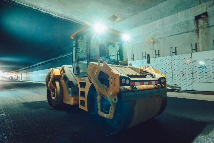 徐工成套高端油面設備,憑借引領行業(yè)的產品技術實力,為媽灣跨海通道的道路建設提供了成套化的高效施工解決方案,確保隧道路面施工作業(yè)圓滿實施。