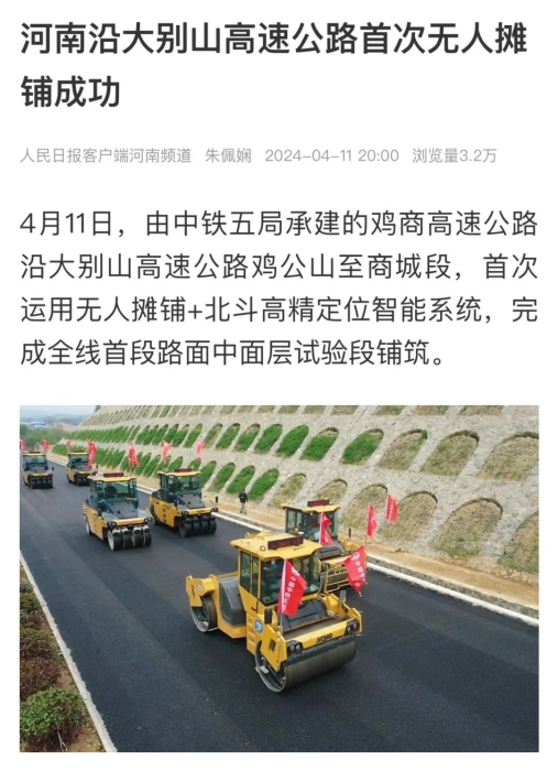 此次試驗(yàn)段是沿大別山高速公路雞公山至商城段JSSG-2標(biāo),首次運(yùn)用無(wú)人攤鋪+北斗高精定位智能系統(tǒng),完成全線首段路面中面層試驗(yàn)段鋪筑。
