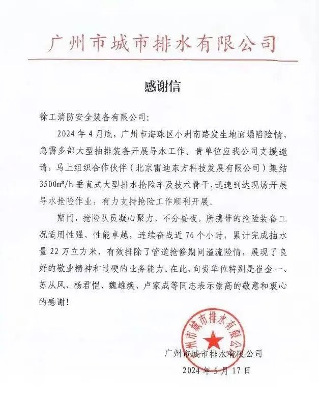 近日,徐工消防收到一封來(lái)自廣州市城市排水有限公司的感謝信,信中熱忱感謝徐工在廣州市海珠區(qū)某地地面坍塌險(xiǎn)情中提供的高效、專(zhuān)業(yè)的設(shè)備及人員支持。