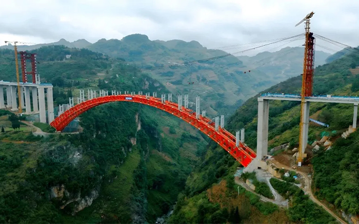 白水河特大橋全長826.5米,是納晴高速重點、難點工程,也是架通黔西北地區(qū)的重要交通樞紐。目前,全橋施工進(jìn)度完成85%,遠(yuǎn)眺建設(shè)中的白水河特大橋,猶如一道彩虹橫跨在山谷之間,氣勢恢宏,巍峨壯觀。