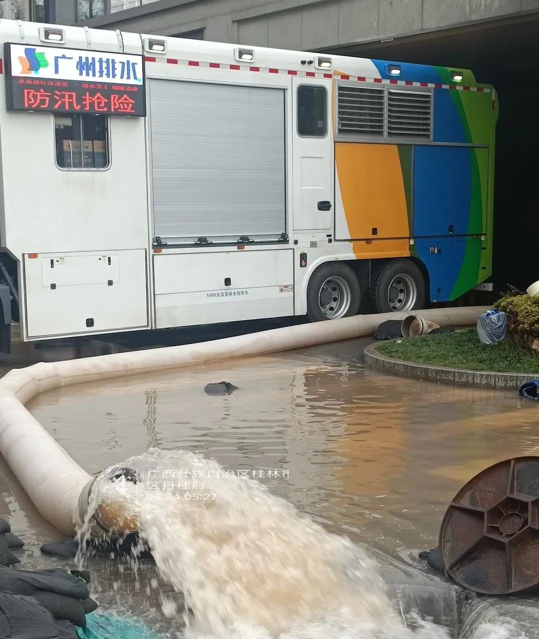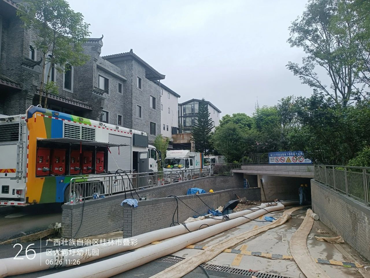 除桂林站地下停車場(chǎng)之外,徐工排澇產(chǎn)品還參與了桂林丹桂府小區(qū)以及大河圩旁的地下車庫內(nèi)澇救援任務(wù)。