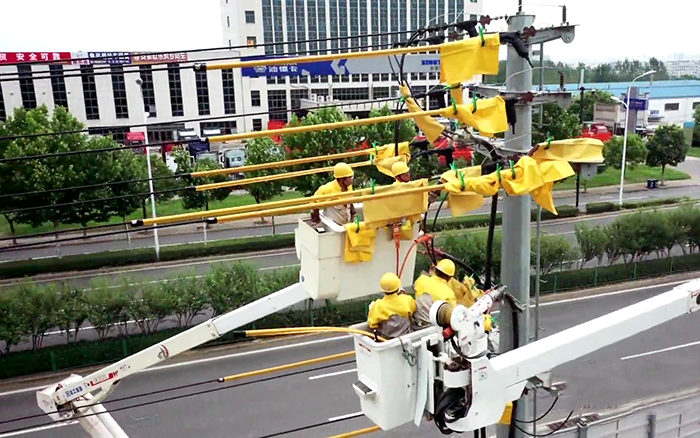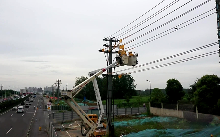 在電力桿線遷改施工現(xiàn)場(chǎng),4名帶電作業(yè)人員嚴(yán)格做好安全措施后,穿上黃色的絕緣服,乘坐徐工GKJH21絕緣斗臂車升入高空,將跨滁河大橋上的原10千伏泗水04線上電纜與架空線連接引線斷開,為當(dāng)日連接新建線路做準(zhǔn)備。整個(gè)施工過(guò)程高效、安全、平穩(wěn),獲得現(xiàn)場(chǎng)施工負(fù)責(zé)人的認(rèn)可。