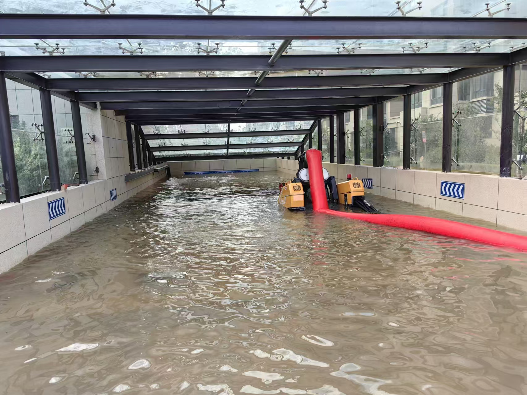 閩泰小區(qū)位于蕭縣龍河街道交通東路,暴雨導(dǎo)致小區(qū)變身“水簾洞”,路面積水已沒(méi)人員小腿,迎街地下車(chē)庫(kù)積水倒灌,出入口已被完全淹沒(méi),近百臺(tái)車(chē)輛無(wú)法轉(zhuǎn)移,受損嚴(yán)重。由于車(chē)庫(kù)平均寬度僅2.5m,大型救援車(chē)輛進(jìn)出受阻,緊急之際,徐工調(diào)派PS50F子母式排澇車(chē)趕往支援。