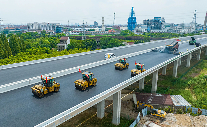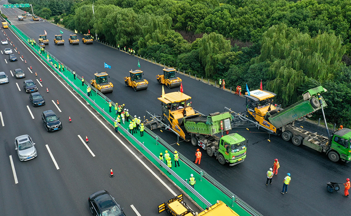 常泰長(zhǎng)江大橋大寬度整幅面層的“一鍵鋪平”,也備受矚目。進(jìn)行此次攤鋪工作的是徐工自主研發(fā)的大米數(shù)攤鋪機(jī)和13噸雙鋼輪壓路機(jī),攤鋪寬度15m,厚度4cm,屬于大寬度的整幅面層攤鋪,實(shí)現(xiàn)施工效率、橋面平整度雙提升。鋪裝工程涵蓋了橋面、主路、匝道等多個(gè)施工場(chǎng)景,充分體現(xiàn)出徐工設(shè)備的廣泛適用性和靈活性。無(wú)論是寬闊的主橋面,還是復(fù)雜的匝道區(qū)域,都能實(shí)現(xiàn)高質(zhì)量的整幅面層攤鋪。
