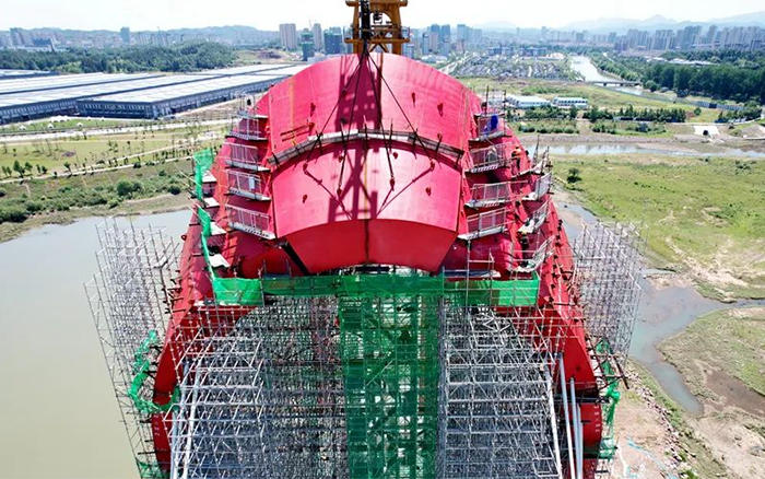 隨著重達(dá)40噸的主橋鋼塔柱最后一個節(jié)段