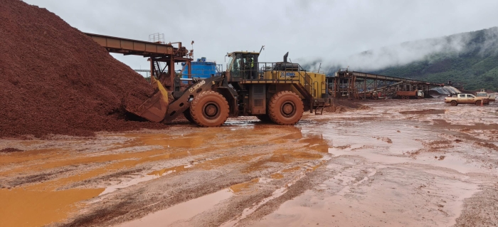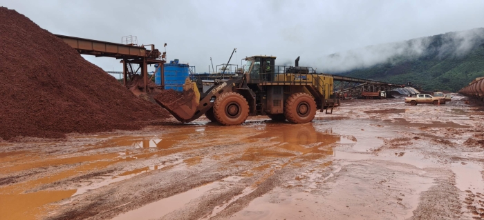 非洲某礦區(qū),徐工LW1200KN輪式裝載機(jī)正對(duì)開采出的礦粉進(jìn)行堆垛作業(yè),恰逢雨季,物料飽含水分,LW1200KN的超強(qiáng)重載性能得到充分展現(xiàn)。