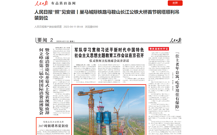 首節(jié)鋼塔吊裝過(guò)程獲得《新聞聯(lián)播》《東方時(shí)空》《人民日?qǐng)?bào)》《央視新聞》、CCTV4、中國(guó)新聞網(wǎng)、新華報(bào)業(yè)網(wǎng)、《新民晚報(bào)》、安徽網(wǎng)、荊楚網(wǎng)、齊魯網(wǎng)、高鐵網(wǎng)、《馬鞍山日?qǐng)?bào)》等多家央省級(jí)主流媒體集中跟進(jìn)報(bào)道,引起廣泛關(guān)注。