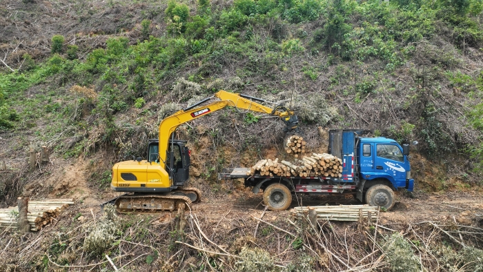 在鄭俊負(fù)責(zé)的林場,每節(jié)木材長度2.6米,徐工XE85GF一次可以夾10節(jié)以上的木材,重量超過1噸,而之前的輪挖夾裝0.6噸木材已是極限。