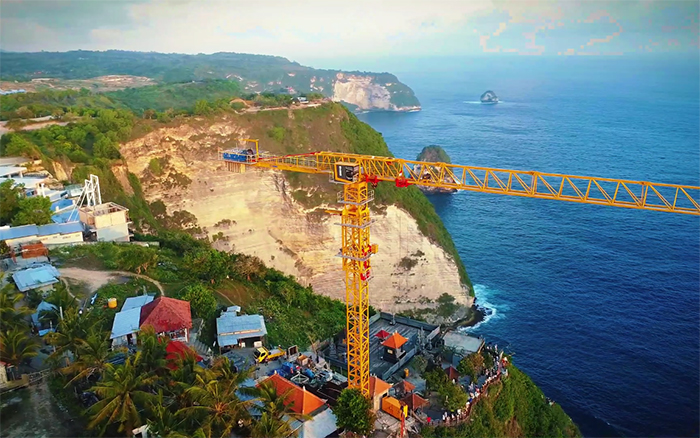 碧藍(lán)海灣、潔白沙灘,在旅游勝地印尼巴厘島,徐工XGT360-20S1屹立在懸崖峭壁之上,眺望懸崖海景和奇特的海岸線景觀,為巴厘島佩尼達精靈海灘觀光電梯項目注入徐工“動力”。