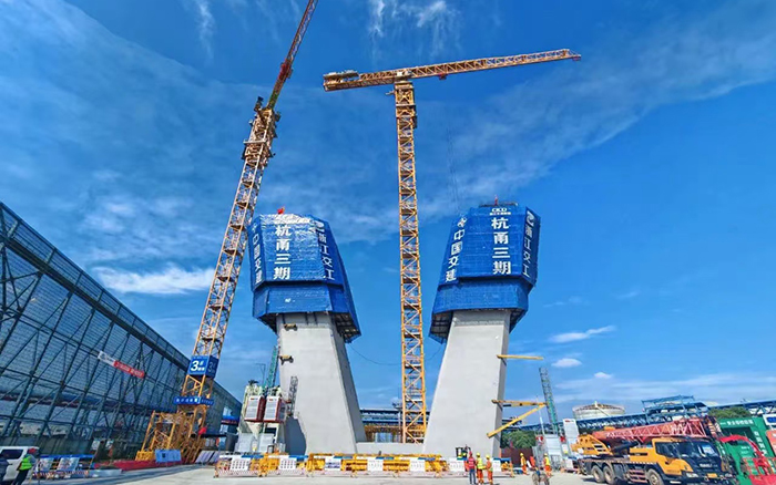 在杭甬復(fù)線寧波三期甬江特大橋施工現(xiàn)場,1臺徐工XGT3000-120S、2臺XGT3000-100S如鋼鐵巨人伸展手臂,正加緊進(jìn)行著鋼筋部品的吊裝,助力3座大橋主塔以平均每天1米的速度向云端挺進(jìn),贏得施工方“技術(shù)先進(jìn)、安全可靠、吊裝能力強(qiáng)、操作平穩(wěn)、智能化水平高、施工效益顯著”的高度肯定。