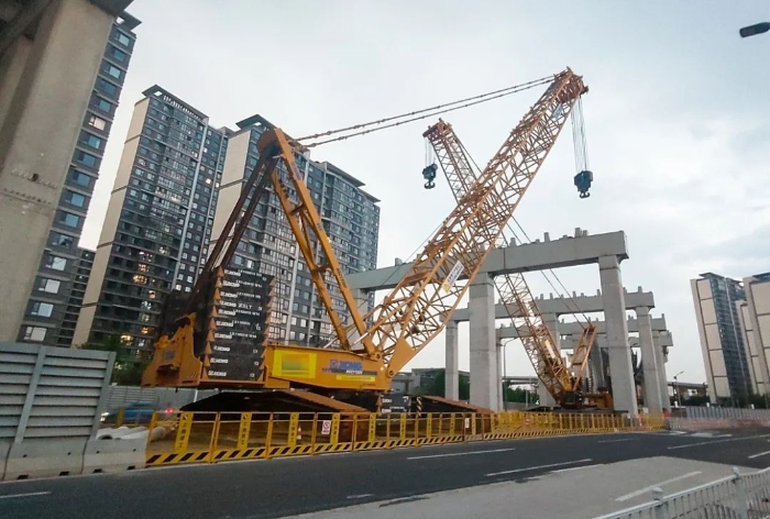 面對有限的操作空間,兩臺徐工XGC11000(650噸級)履帶起重機采用42米標準主臂工況,分別精準定位在梁體兩側狹窄區(qū)域內,將重達60噸的預制混凝土預制梁,穩(wěn)穩(wěn)吊離運梁車,梁體全程保持水平“懸浮”。
