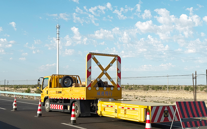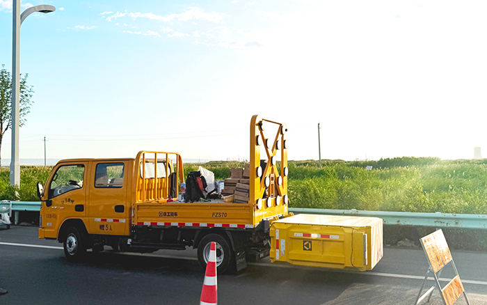 不光是安全衛(wèi)士,它們還是高效的 “移動倉庫”。貨箱敞開著,里面整齊碼放著鐵鍬、瀝青、警示錐等施工所需的工具和材料。施工時,人員無需來回奔波取物,伸手就能拿到需要的東西,讓施工節(jié)奏得以加快,省去了不少麻煩。當施工收尾,防撞緩沖車駛離后,留下的不僅是平整的路面,更有它們?yōu)檫@次施工全程護航的印記。