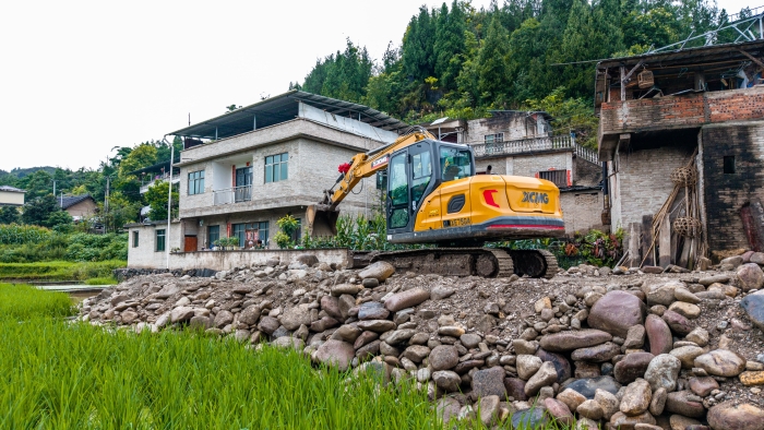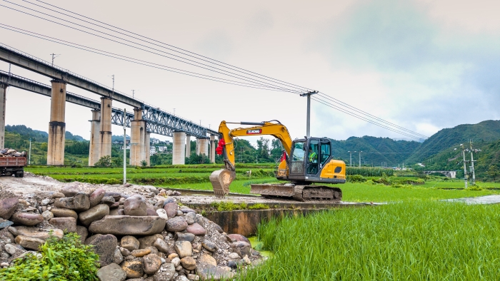 雨季施工,場地濕滑狹窄,對設(shè)備靈活性、可靠性和機手技術(shù)都是嚴(yán)峻的考驗。在這片泥濘的稻田邊、陡峭的坡地上,身披“徐工金”的XE75GA挖掘機,正化身開路先鋒,為苗鄉(xiāng)新居夯下第一塊基石。