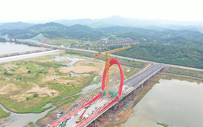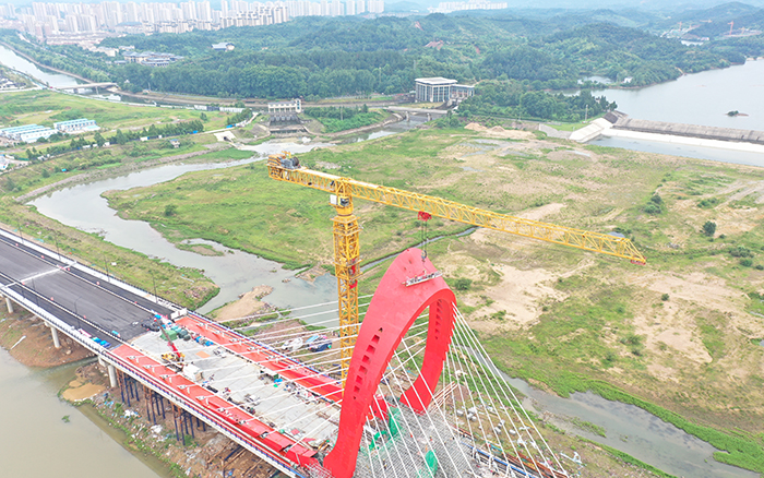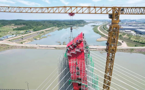 在大別山腹地、金寨縣史河河畔,“紅色搖籃”傲視遠(yuǎn)方,徐工XGT2230-100S塔機(jī)揮舞著巨臂,隨著重達(dá)40噸的主橋鋼塔柱最后一個(gè)節(jié)段起吊安裝到位,金寨史河大橋主塔順利合龍。