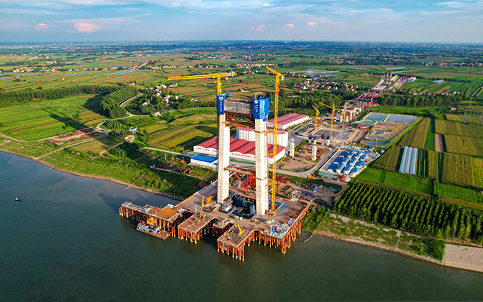 初秋時(shí)節(jié),長江之畔,兩臺(tái)徐工XGT600A-25S塔機(jī)鐵臂揮舞,助力荊州李埠長江公鐵大橋南岸主塔下游側(cè)第18節(jié)塔柱順利完成澆筑。