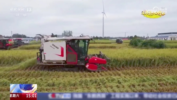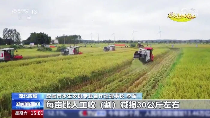 9月20日,中央電視臺(tái)新聞?lì)l道《新聞直播間》“在希望的田野上”欄目將鏡頭對準(zhǔn)湖北應(yīng)城,報(bào)道了八臺(tái)徐工XR720履帶式谷物聯(lián)合收獲機(jī)在當(dāng)?shù)亻_展大規(guī)模糯稻收割的豐收盛景——履帶滾滾,金黃的稻穗迅速被吞入機(jī)器,頃刻間完成收割、脫粒、清選等一系列作業(yè),顆顆飽滿的籽粒穩(wěn)穩(wěn)落入糧倉。