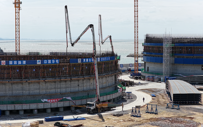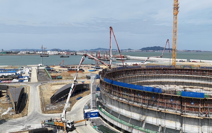 隨著各環(huán)節(jié)建設(shè)有序推進(jìn),3座22萬(wàn)立方米的LNG(液化天然氣)儲(chǔ)罐正式進(jìn)入罐體墻體澆筑。每座儲(chǔ)罐高達(dá)50多米,相當(dāng)于18層樓高度,海風(fēng)裹挾的高濕度環(huán)境,給高空作業(yè)難度層層加碼!