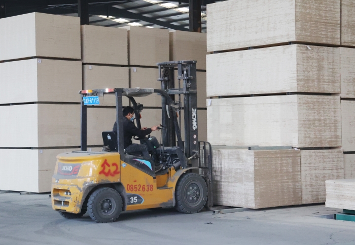 在山東菏澤某大型板材廠內,二十余臺徐工鯤鵬叉車、新E叉車組成的"黃金戰(zhàn)隊",以高效穩(wěn)定的作業(yè)表