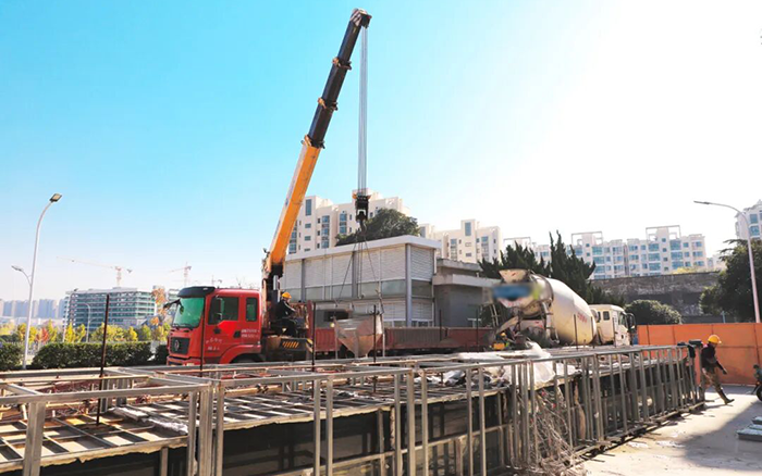 徐工隨車起重機伸展金色長臂,精準掛鉤作業(yè)裝置,與一旁的混凝土攪拌車緊密配合,將混凝土穩(wěn)穩(wěn)輸送至鋼筋框架結構內。