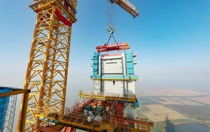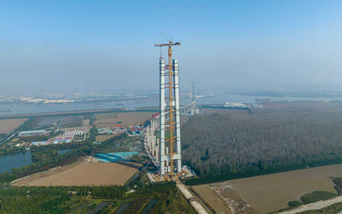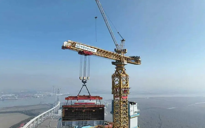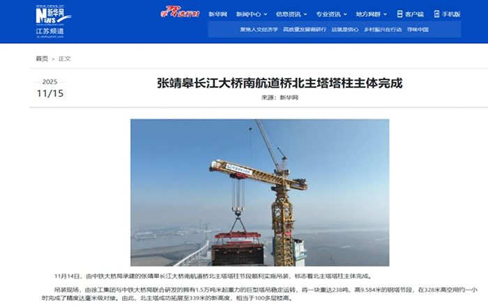 在靖江市馬洲島上空,重達238噸的T29鋼塔節(jié)段在徐工XGT15000-600S超級塔機的穩(wěn)定牽引下平穩(wěn)攀升,精準完成高空對接,整個吊裝過程中,塔身始終穩(wěn)如磐石,為張靖皋長江大橋關(guān)鍵節(jié)點的突破提供了堅實支撐。