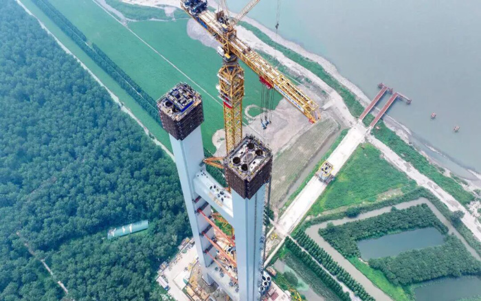 徐工XGT15000-600S采用的創(chuàng)新左右并聯(lián)式、倒三角截面雙臂架結(jié)構(gòu),有效降低江面風(fēng)阻,顯著增強結(jié)構(gòu)剛性,成功攻克“高空精度、抗風(fēng)穩(wěn)性”的施工難題。