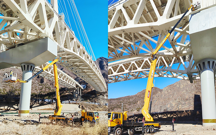徐工 GKH65 高空作業(yè)車憑借強悍跨障能力,在這座關(guān)鍵橋梁的側(cè)面管路安裝施工中,盡顯硬核實力,為橋梁運維領(lǐng)域樹立全新技術(shù)標桿。