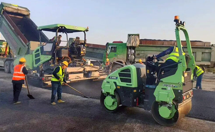 在河北道路施工中,徐工RP905HEV混動(dòng)攤鋪機(jī)與XD120EP純電壓路機(jī)組成“新能源搭檔”。